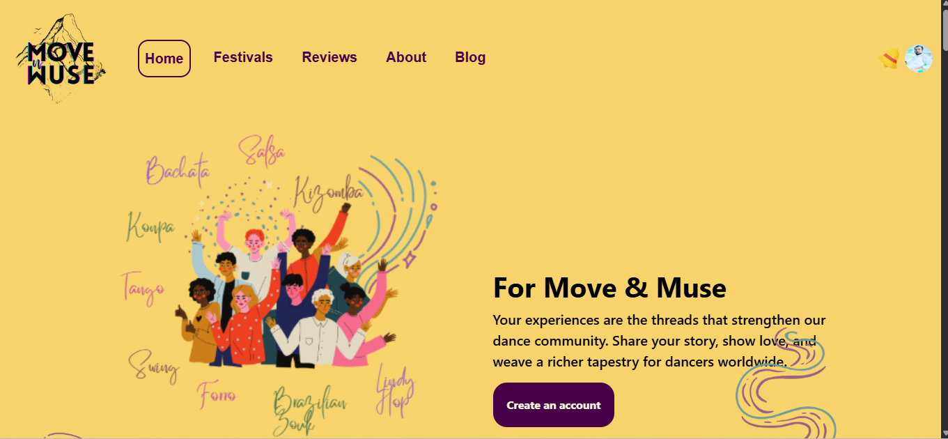 This website allows users to create upcoming dance events, view past events, and leave reviews on festivals. Users can also submit blogs to the admin, either to request new events or to provide feedback. To explore more details, click the link below